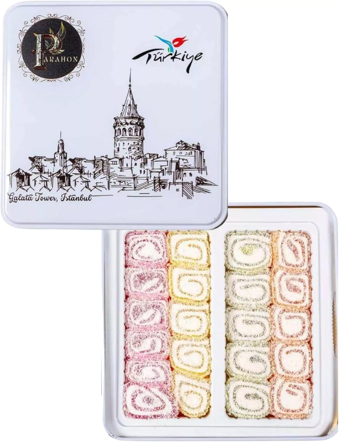 Turkish Delight Halal Sweets Snacks, Rolled Fruit Aroma Lokum Tin Gift Box, Rolled Fruit Mixed Aroma 500g