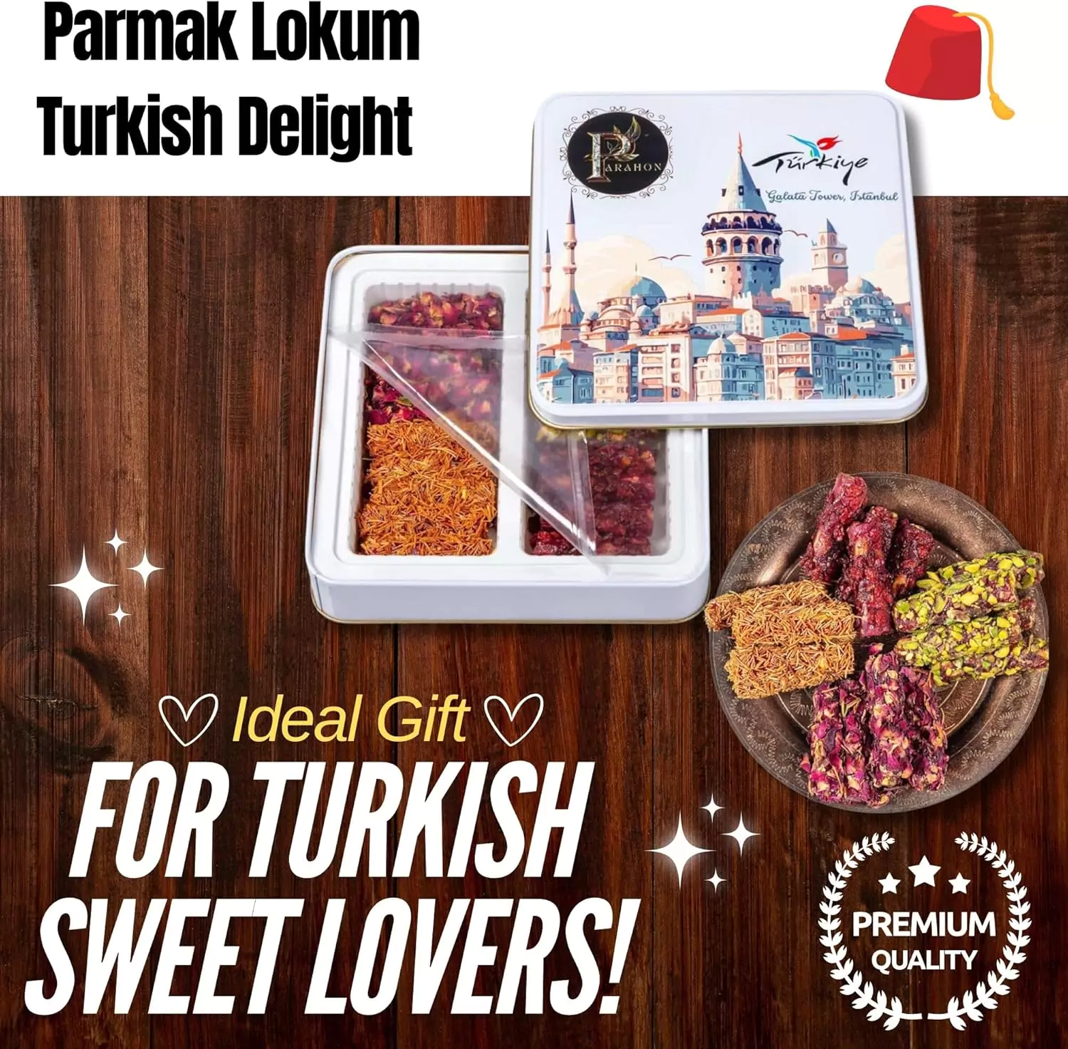 Turkish Delight Halal Sweets Snacks Tin Box , Parmak Lokum With Rose, Pistachio and kunafa Sprinkles 300g